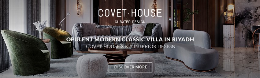 Here we can see a modern classic style, keeping it very Arabian-focused with the golds and the opulent magnitude of the spaces. Plus, there’s the timeless Odette Sofa and its sweeping silhouette that we love so much. Such a beautiful living room!
